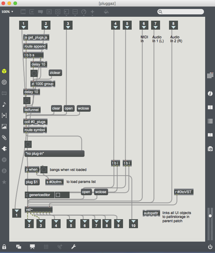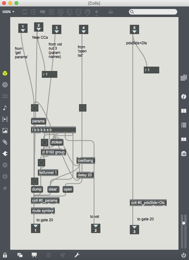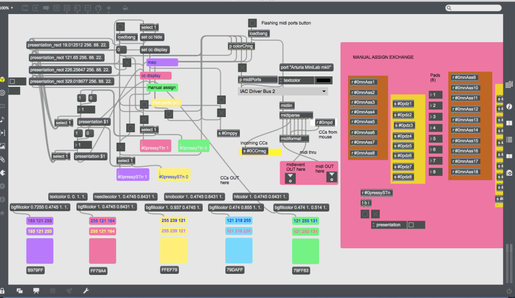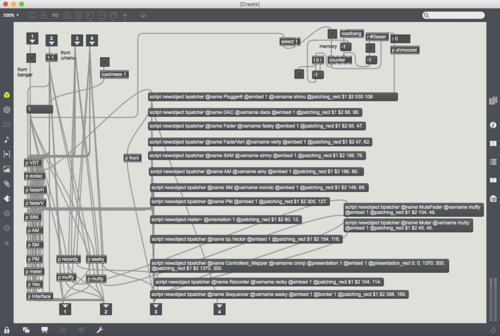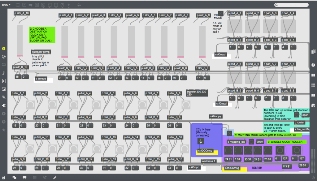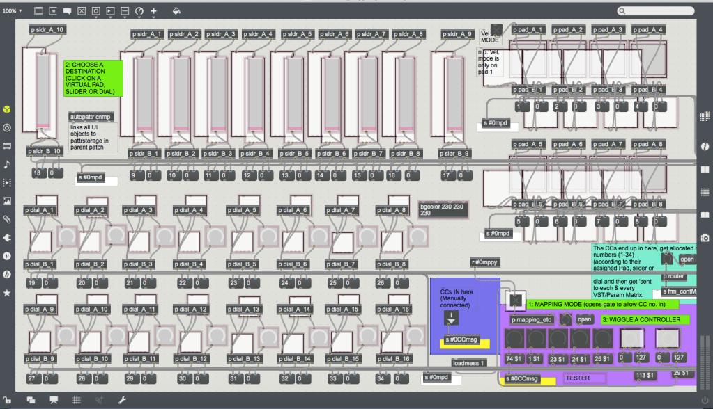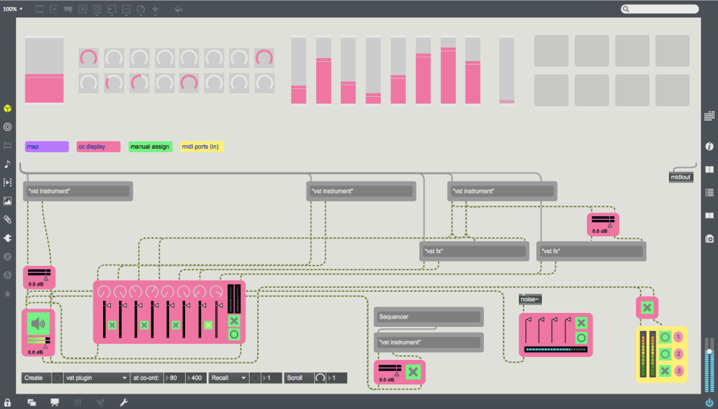 While Mainstage and GigPerformer are fine, I recently decided to build my own VST host in Max 7. It consists of an almost blank main patcher onto which a number of modules (stored as bpatchers) can be instantly generated using a menu bar at the bottom left-hand corner. These custom modules range from a CC interface made up of virtual dials, sliders and pads that can be mapped to hardware controllers; discreet mixer components, streamlined expandable VST modules capable of remapping the interface’s controls to specific plug-in parameters, and sequencers/audio recorders that can be synced to Max’s global transport (or not). It is important to note that this project has been made using Max 7, and while that version doesn’t feature Max 8’s easy mapping feature, I’ve created my own mapping system that works in Max 7 and functions in a similar easy-to-use fashion.