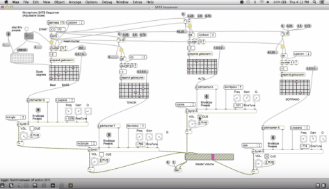 A watershed moment came when, while researching alternate user-interface options in 2011, I discovered Max/MSP. This system allows musicians with little-to-no programming experience an affordable entry point into the world of computer-music recording/sound-synthesis/user-interface design. Instead of spending countless hours learning to work around the quirks of someone else’s DAW system I could spend countless hours learning how to build my own discreet project studio tools, each designed to do perform one task optimally rather than many less-than-adequately.